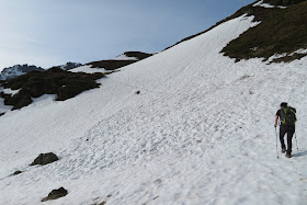 On commence à trouver quelques plaques de neige. Mais on est versant Sud, elle n'est pas glacée.