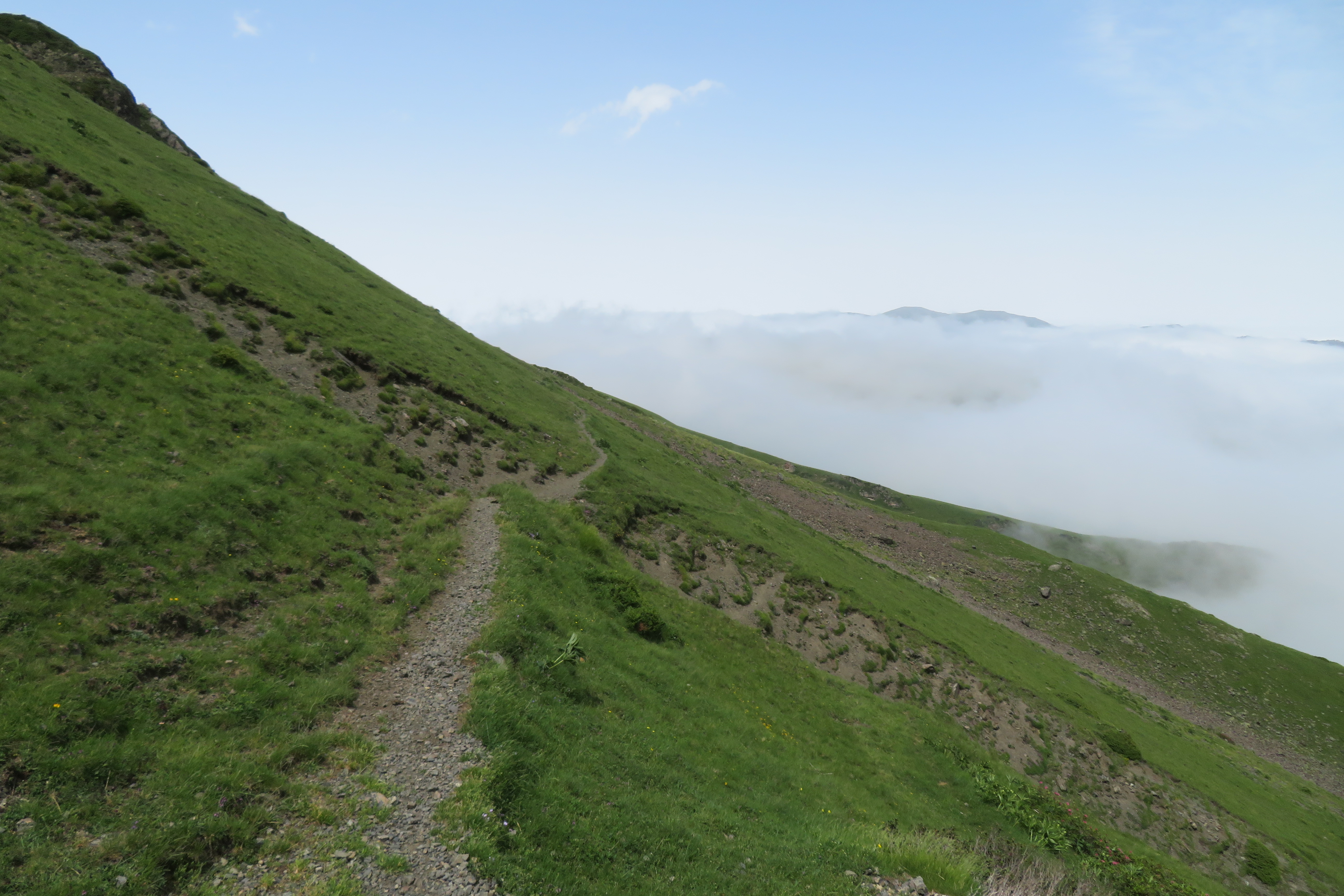Une mini trace dans l'herbe nous conduit vers le lac. Vu le terrain, l'emplacement du lac est évident. Le pic de Pébigneau plein centre.