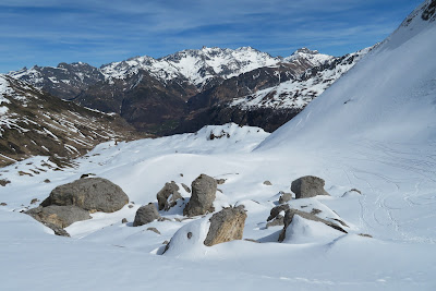 On va passer dans ce vallon. C'est le lit du torrent le "Barrancou des Laguettes" en fait. Mais aucun risque qu'on mette les pieds dans l'eau, vu l'épaisseur de la neige.